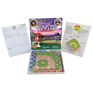 Enjoy America’s favorite pastime in a whole new way with baseball-themed TiViTz, endorsed by National Baseball Hall of Fame Inductee, Cal Ripken, Jr. Go for the big leagues and the big scores as you move your tivits from the dugout and across the ball field to outwit and outscore your opponent! Each board game comes with an 11”x11” playing surface, 30 gamesheets, a blank gamesheet to laminate, 10 two-sided score sheets and 18 tivits.